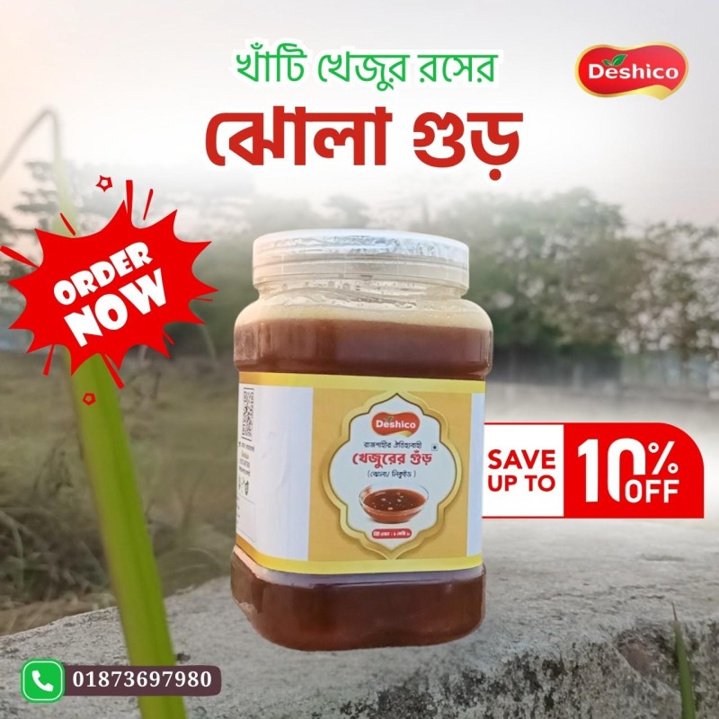 স্বাদ ও পুষ্টিতে অনন্য, সরাসরি রাজশাহীর সুপ্রসিদ্ধ খেজুরের রস থেকে তৈরি আমাদের খাঁটি ঝোলা গুড়।